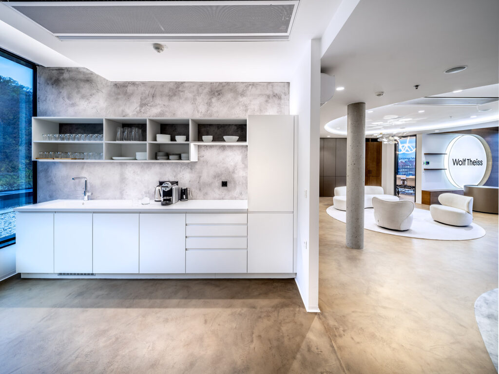 Stěnu nad recepcí jsme osadili celoplošným podsvíceným logem Wolf Theiss, frézovaným z translucentní desky Corian. Elegantní světelný prvek se stává vizuálním kotvícím bodem celého prostoru, stejně jako různé úrovně osvětlení pro světelnou pohodu.