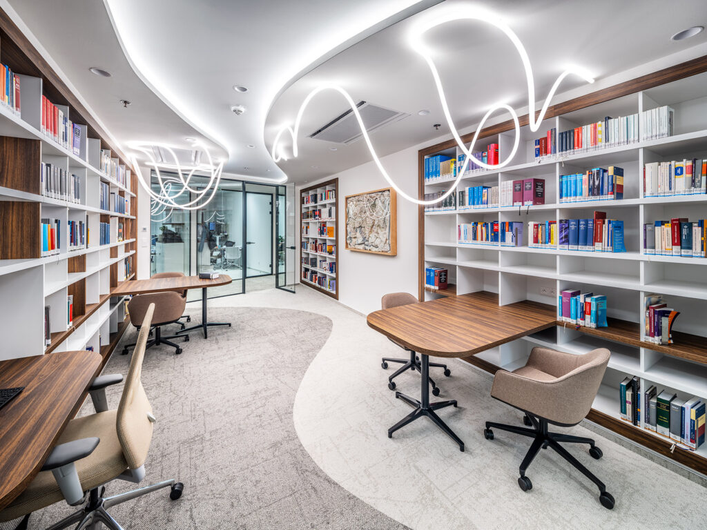 Knihovna slouží ke studiu, individuální práci i neformálním setkáním. Stěny jsme vybavili velkými knihovnami se zabudovanými pracovními stoly, které jsme vyráběli na míru v kombinaci bílé a tmavého dekoru. Prostorem se vine designové stropní svítidlo připomínající elegantní světelné linky. Světelný prvek vnáší do formálního prostředí hravost, pohyb a jemné oživení.